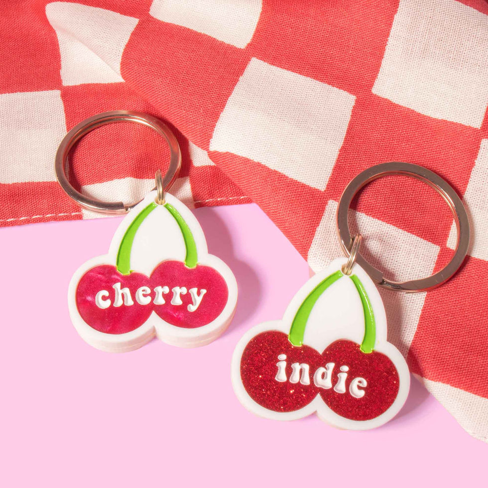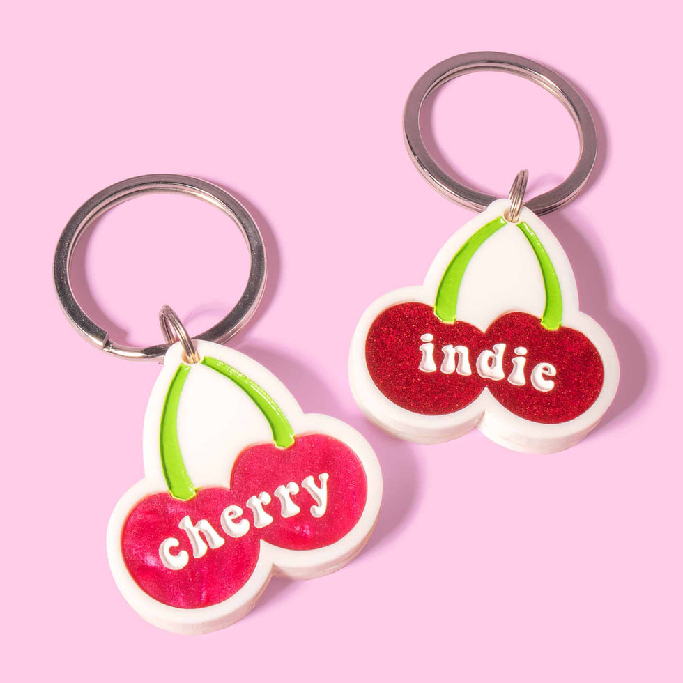 For your cherrific four-legged cutie, our cherry pet tag is made of either glitter red and marble pink acrylic. Personalized on the back with your pet's name and contact information. Handcrafted, lightweight, quiet and waterproof.