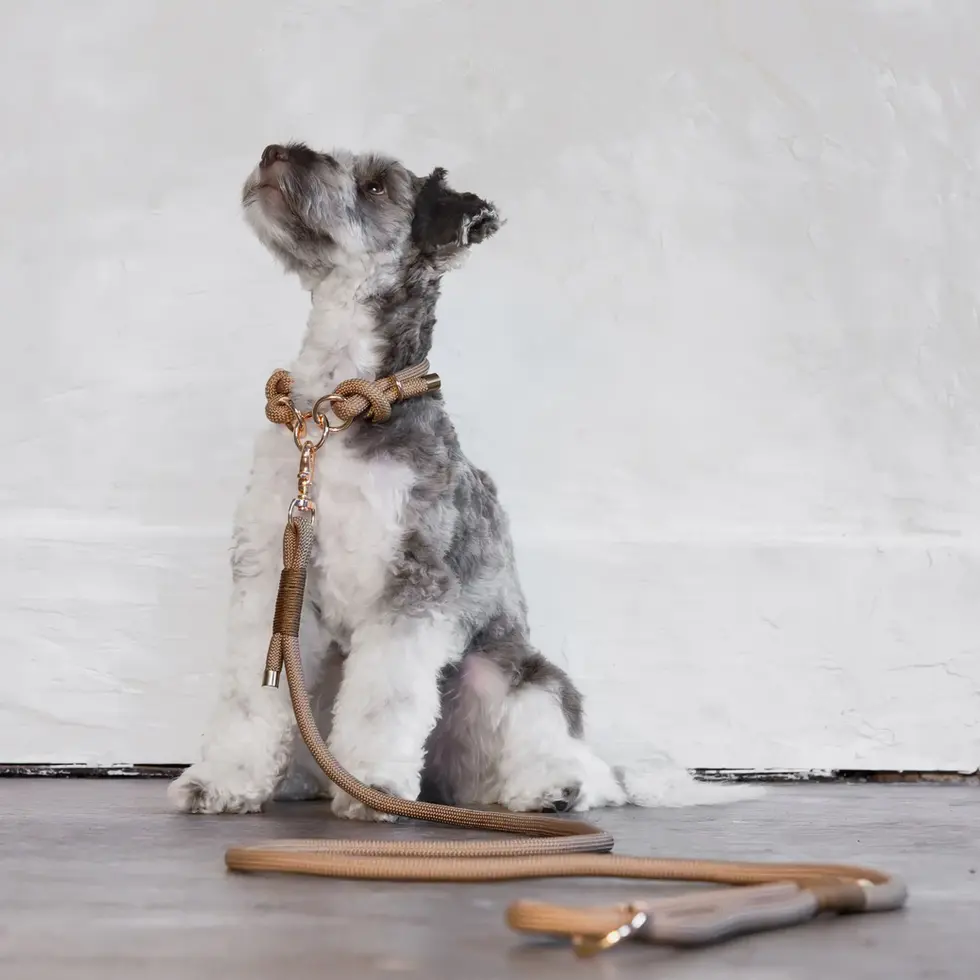 We believe a leash should feel as good in your hand as it looks on your dog. Each piece in our Interlace 01 collection is hand-knotted with a focus on tactile comfort and "life-proof" durability. Our rope is soft to the touch from day one with no stiff break-in period and finished with gold hardware that adds a little shine to your daily walk.