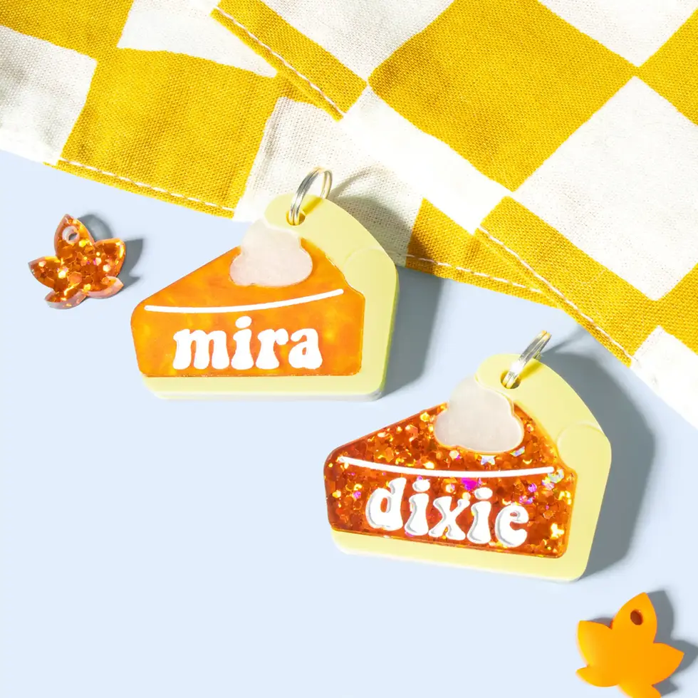 Our yummy pumpkin pie pet tag was redesigned in fun new fall colors. Choose from glitter or marble orange. Engraved with your pet's name on the front and contact information on the back. Handcrafted, lightweight, quiet and waterproof.